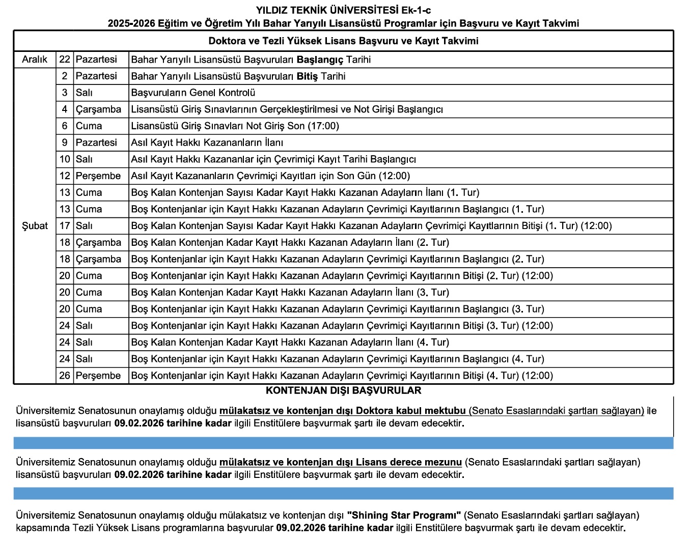 2025-2026 Bahar Dönemi Lisansüstü Program Başvuruları Değerlendirme süreci tamamlanmıştır. Adaylarımızın başvuru yapmış oldukları programlara ait aday değerlendirme listelerindeki sıralamaları, genel değerlendirme sonucunda almış oldukları nihai puanlara göre sistem tarafından otomatik olarak belirlenmiştir. Değerlendirme sonuçlarına başvuru yapmış olduğunuz https://obs.yildiz.edu.tr/oibs/ina_app/ adresinden ulaşabilirsiniz.