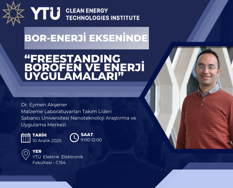 Bor-enerji ekseninde seminer serisi kapsamında, nanoteknoloji ve enerji alanlarında yürütülen güncel araştırmaların paylaşılacağı seminerimizin konuğu Dr. Ahmet Eymen Akşener olacaktır. Dr. Akşener, “Freestanding Borofen ve Enerji Uygulamaları” başlıklı sunumunda, borofen ve benzeri bor-tabanlı malzemelerin sentez yaklaşımları, yapısal ve elektronik karakterizasyon yöntemleri ile bu yeni nesil malzemelerin enerji depolama, dönüşüm ve iletim teknolojilerindeki olası uygulama alanlarını ele alacaktır.