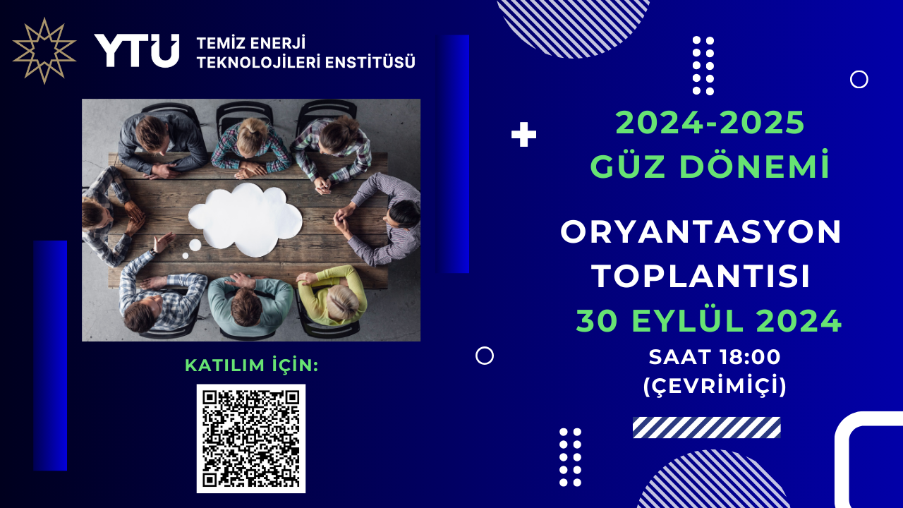 2024-2025 Akademik Yılı Güz Dönemi için 30 Eylül 2024 tarihinde saat 18:00-19:30 arasında oryantasyon toplantısı yapılacaktır. Lisansüstü süreçlerin aktarılacağı bu toplantıya tüm öğrencilerimizin katılımını beklemekteyiz.
