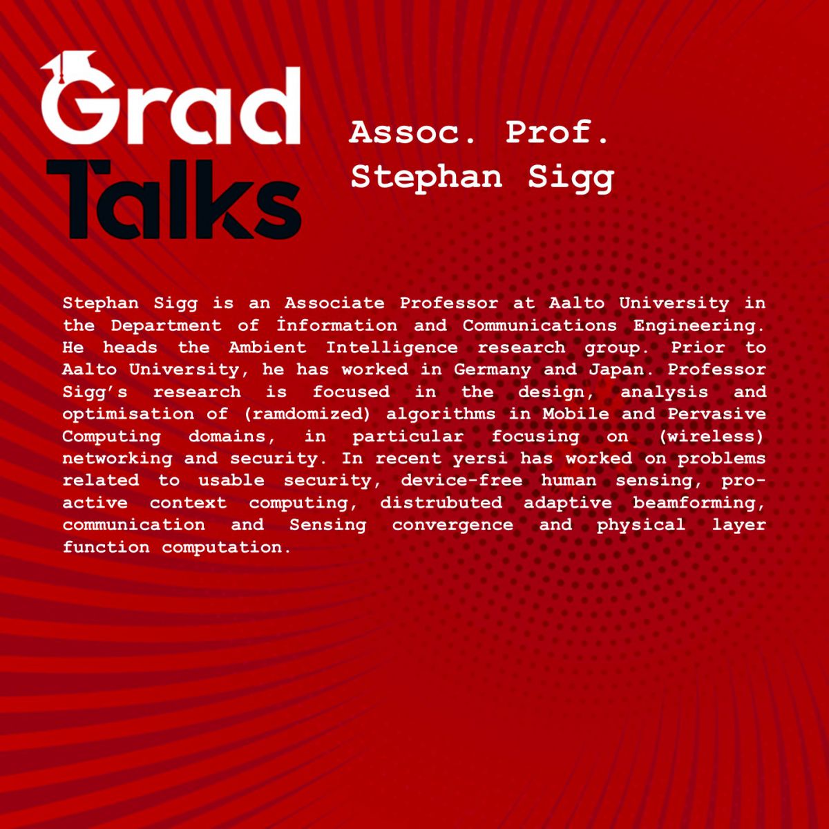 Enstitülerimiz tarafından düzenlenen "Grad Talks" serisinin otuz dokuzuncu semineri 23 Kasım 2023 Perşembe günü Saat 18.00'de Zoom üzerinden yapılacaktır. Grad Talks Seminer Serisinin otuz dokuzuncu konuğu, Aalto University'den Dr. Stephan Sigg olacaktır. Detaylı bilgi aşağıda sunulmuştur. Konu ile ilgilenen tüm paydaşlarımız davetlidir.