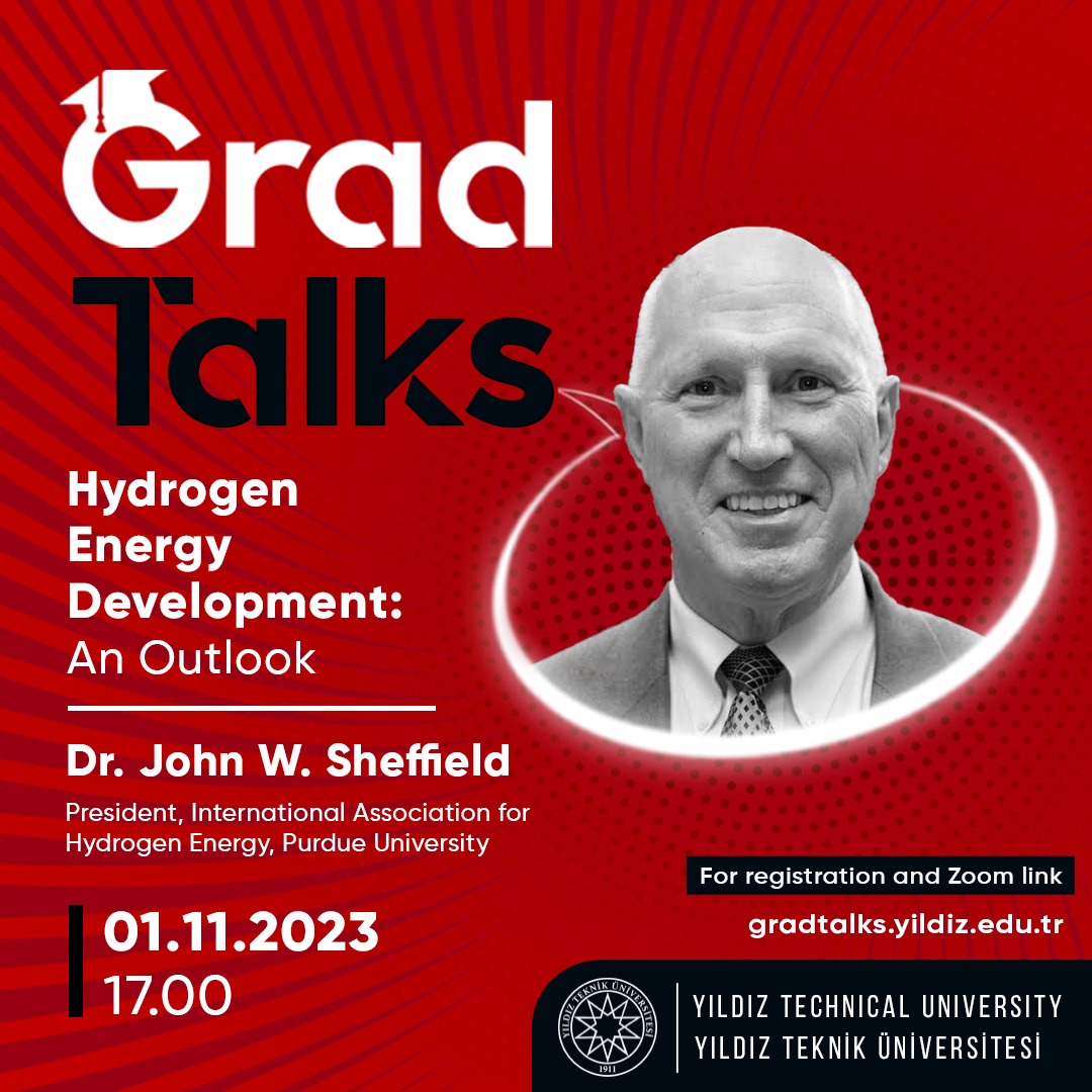 Enstitülerimiz tarafından düzenlenen "Grad Talks" serisinin otuz sekizinci semineri 1 Kasım 2023 Çarşamba günü Saat 17.00'de Zoom üzerinden yapılacaktır. Grad Talks Seminer Serisinin otuz sekizinci konuğu, Purdue University'den Dr. John William Sheffield olacaktır. Dr. Sheffield halihazırda International Association for Hydrogen Energy Başkanlığı görevini yürütmektedir. Detaylı bilgi aşağıda sunulmuştur. Konu ile ile ilgilenen tüm paydaşlarımız davetlidir.